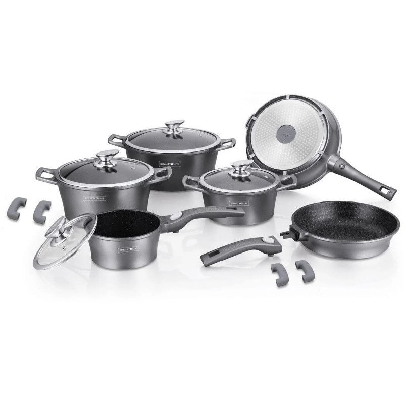 Комплект тенджери и тиган ROYALTY LINE RL-ES2014M, 14 части, Мраморно покритие, Индукция, Сребрист
