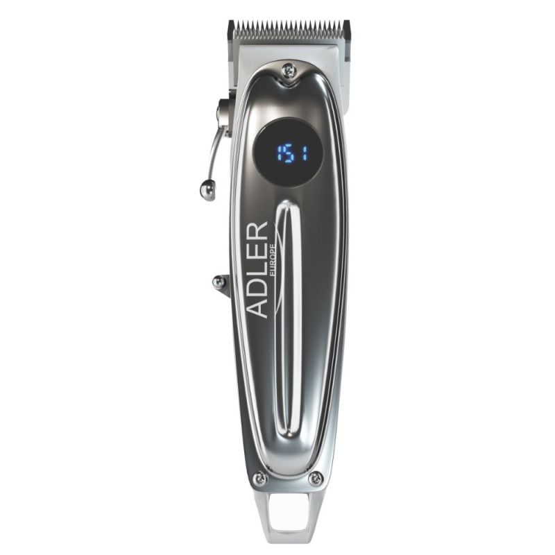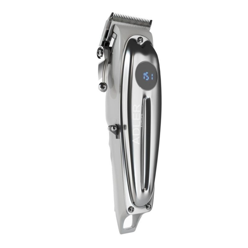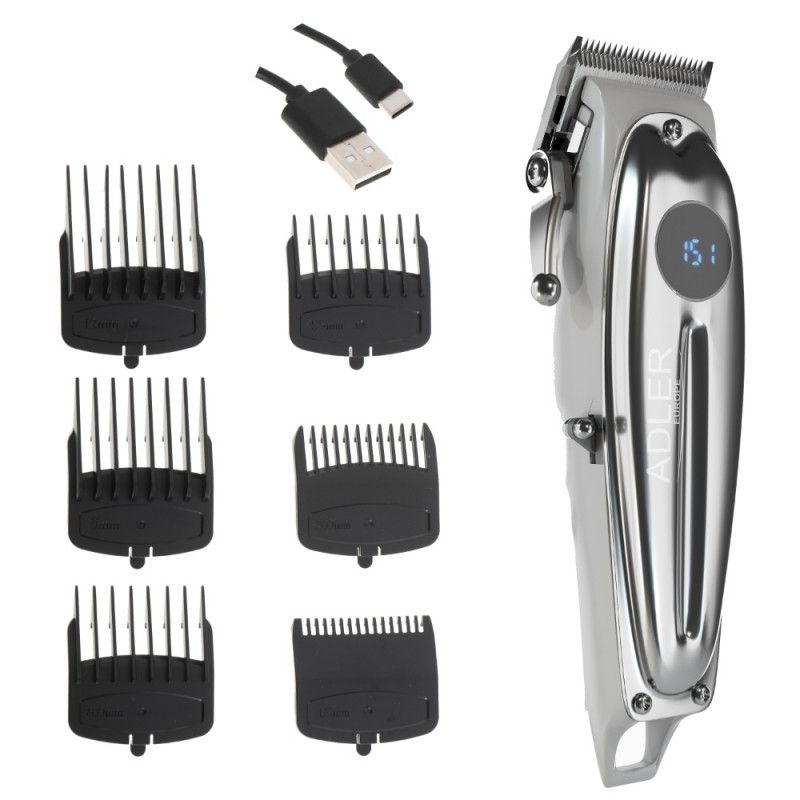Професионална машинка за подстригване ADLER AD 2831, 100W, Батерия 2200 mAh, 6 приставки, USB, LCD дисплей, Сребрист