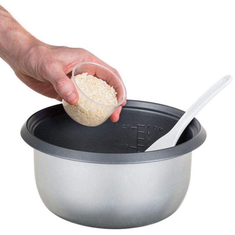 Нашият уред за варене на ориз на пара е подходящ за големи домове и ще допринесе за правилното хранене на цялото семейство. Можете да приготвите до 14 порции по 200 грама всяка наведнъж или по-малко, според потребностите. Приложихме мерителна купичка и лъжичка за прецизност при спортни и медицински диети.