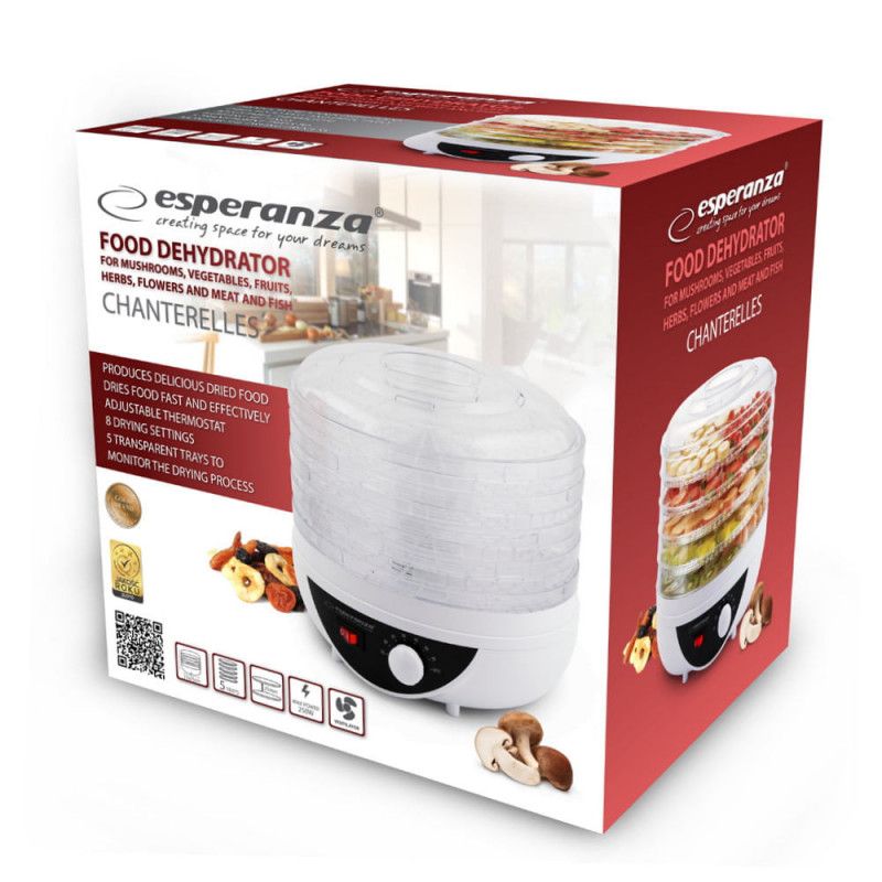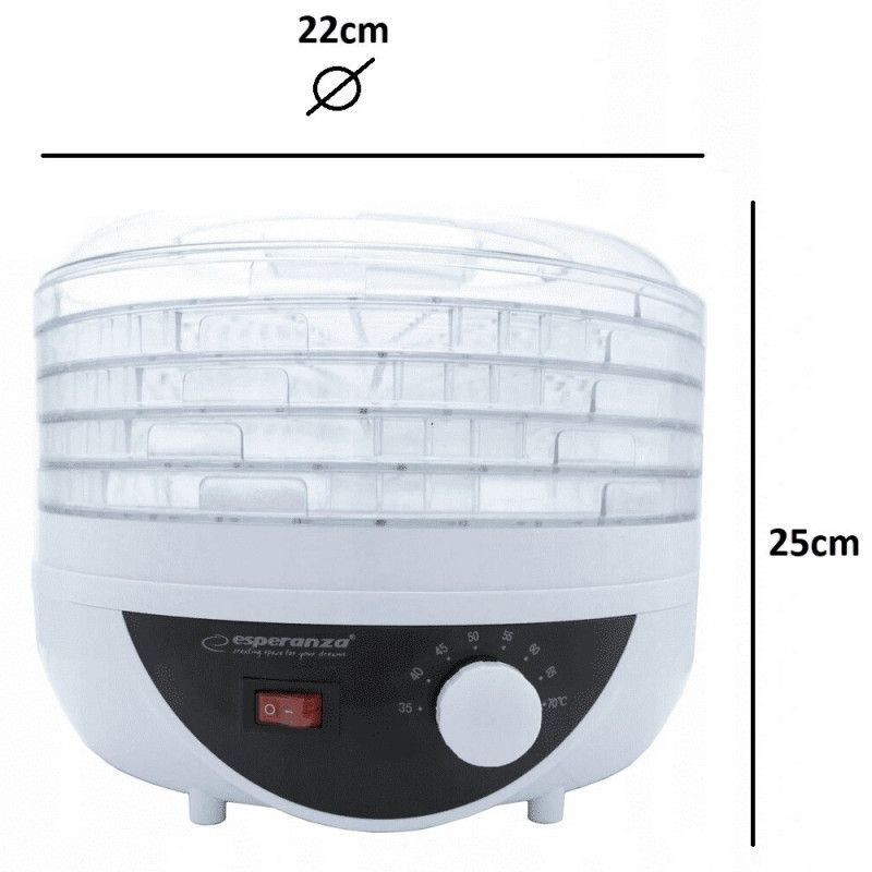 Сушилня за плодове и зеленчуци ESPERANZA EKD002, 250W, 5 нива, 35-70C, Вентилатор, Термостат, Бял