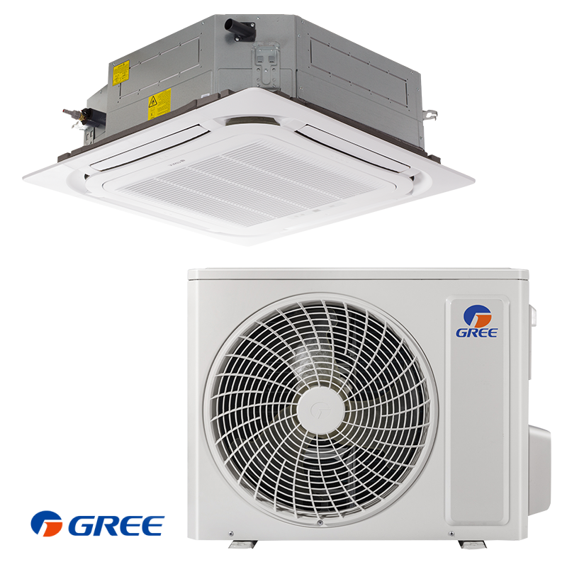 Касетъчен климатик GUD160T1 + GUD160W1/NHA-X на климатични системи Gree е 4-пътна касета с висок клас на енергийна ефективност, подходяща за монтиране в окачени тавани в търговски или офис помещения. Подобрената конструкция на тялото ви гарантира ниско ниво на шум и лесна поддръжка. (в комплекта е включено безжично IR дистанционно)