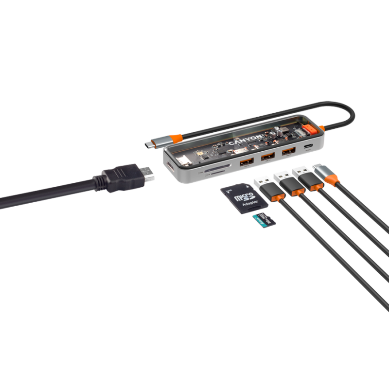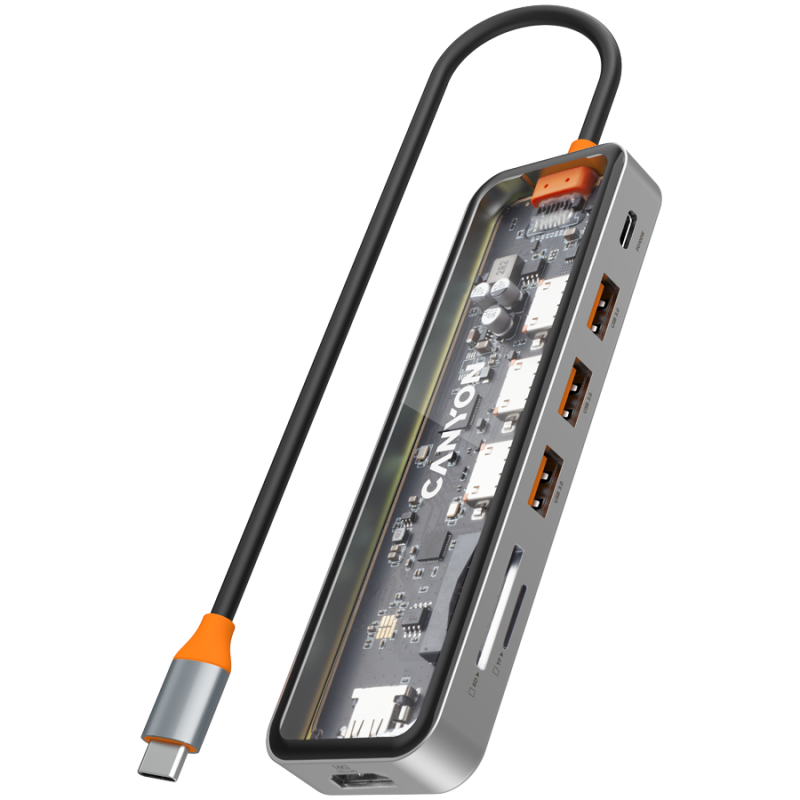 USB Hub CANYON DS-13, Zinc alloy+Tempered glass+TPE Port: Type-C To USB3.0*3(5Gbps)+SD/TF 3.0(5Gbps)+HDMI(4K@30Hz),Space Grey