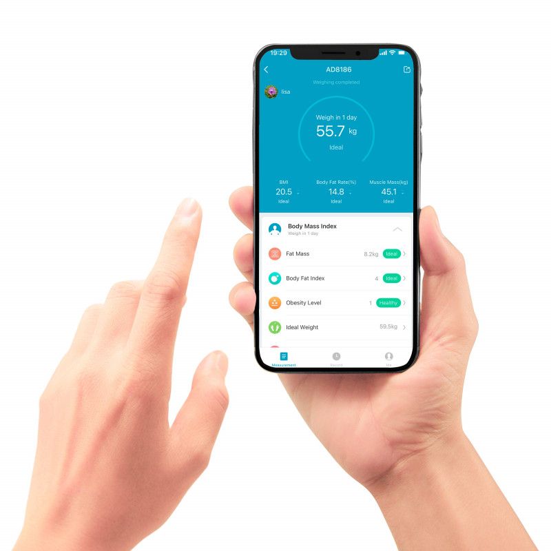 Разширени параметри: Ниво на висцерална мазнина (в %), Ниво на протеин, Метаболитна възраст, Мастна маса, Индекс на телесните мазнини, Индекс на затлъстяване, Идеално тегло, Контрол на телесното тегло, Чиста телесна маса, BMR (основна скорост на метаболизма), Тип тяло, Резултати и тенденции