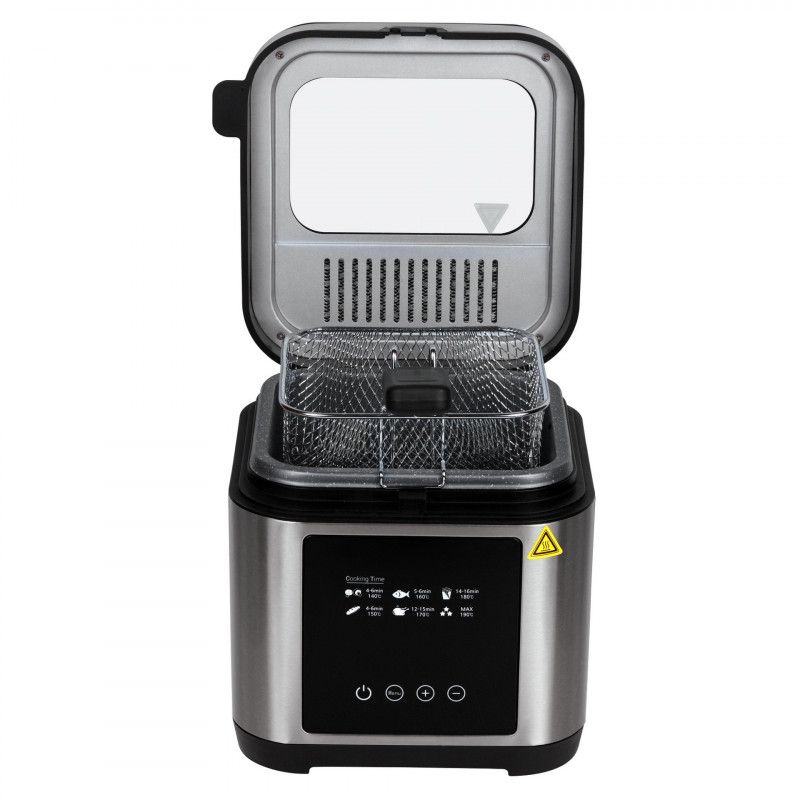Фритюрник Elite EDF-1103, 1200W, 2.5 л, 190C, Капак с прозорец за наблюдение, Филтър против миризми, Дигитален контрол, Черен/инокс