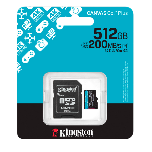 MicroSD памет 512GB KINGSTON Canvas Go! Plus Gen4, microSDXC Class 10, UHS-I, U3, V30, A2 up to 200MB/s + SD адаптер