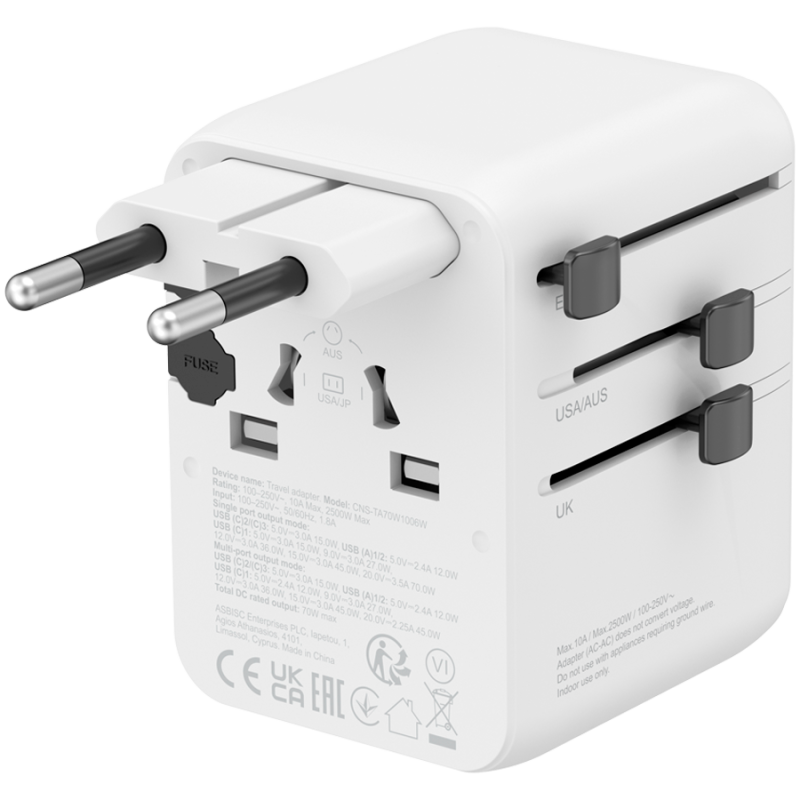 Универсален адаптер за пътуване CANYON OnTour 70, EU/UK/US/AUS 70W  White