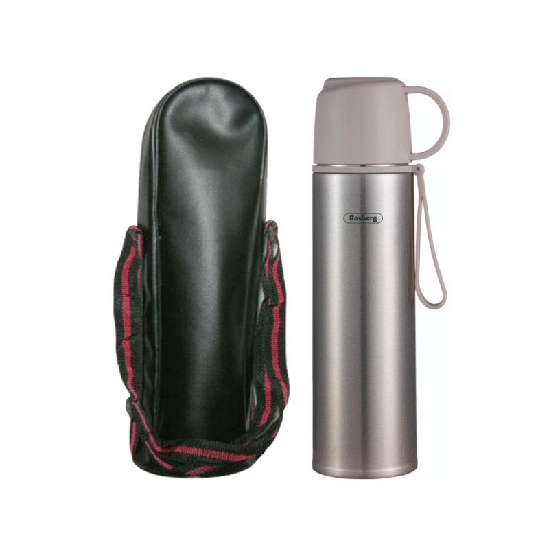 Термос с калъф Rosberg R52010FB, 0.5 л, Двуслойна вакуумна изолация, Капак чаша, Сив/инокс