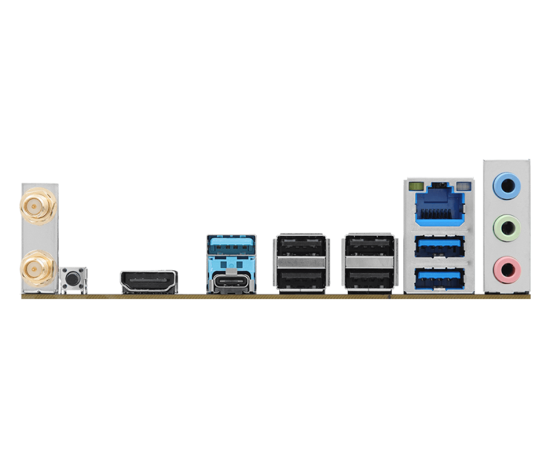 I/O:2 x Antenna Ports;1 x HDMI Port;3 x USB 3.2 Gen1 Type-A Ports;1 x USB 3.2 Gen1 Type-C Port;4 x USB 2.0 Ports;1 x RJ-45 LAN Port;1 x BIOS Flashback Button;HD Audio Jacks: Line in / Front Speaker / Microphone