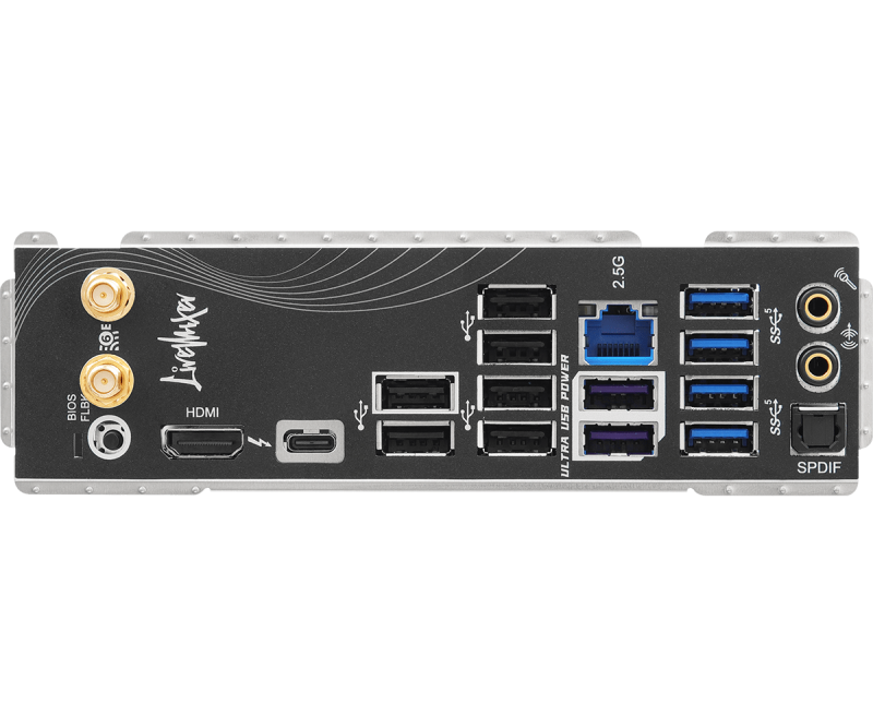 I/O:2 x Antenna Ports;1 x HDMI Port;1 x Optical SPDIF Out Port;1 x Thunderbolt™ 4/USB4 Type-C Port (40 Gb/s);6 x USB 3.2 Gen1 Ports;6 x USB 2.0 Ports;1 x RJ-45 LAN Port;1 x BIOS Flashback Button;1 x Line Out Jack (Gold Audio Jack);1 x Microphone Input Jack...