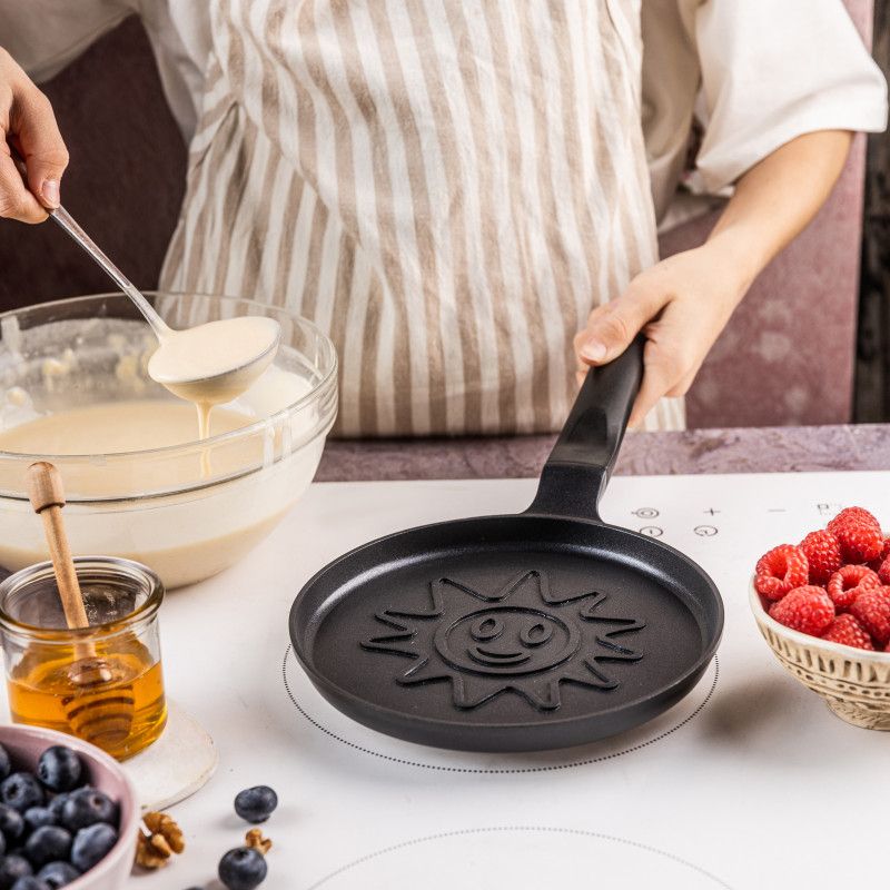 Тиган за палачинки Klausberg KB 7972, 18 см, Релефно дъно със слънце, Незалепващо покритие, Без PFOA, Индукция, Черен