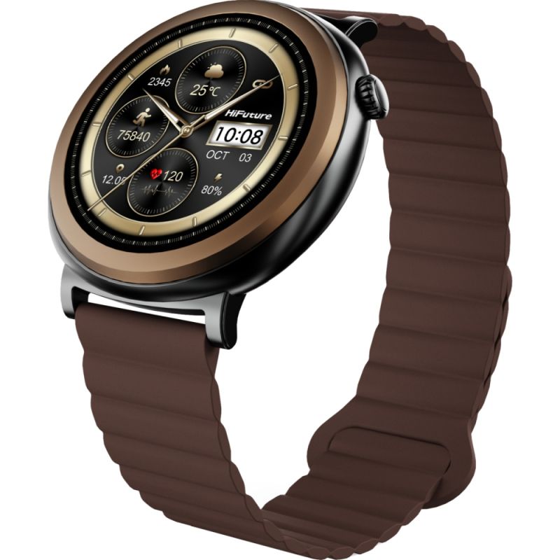 Часовник HiFuture Aurora Brown, 1.43" AMOLED, 466*466, Powered by Dual Core & Syntra AI, Bluetooth Call, IP68 Waterproof, 24/7 True Heart Rate & Blood Oxygen Sensor, Up to 10 days daily use, Magnetic Strap