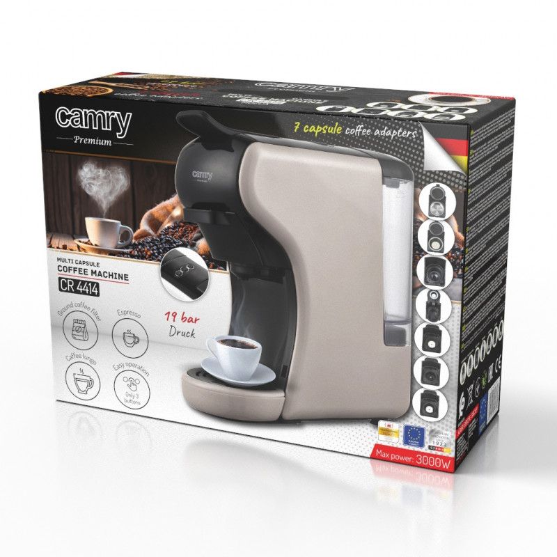 Еспресо машина за мляно кафе и капсули 9в1 Camry CR 4414, 3000W, 19 bar, Бежов/Черен