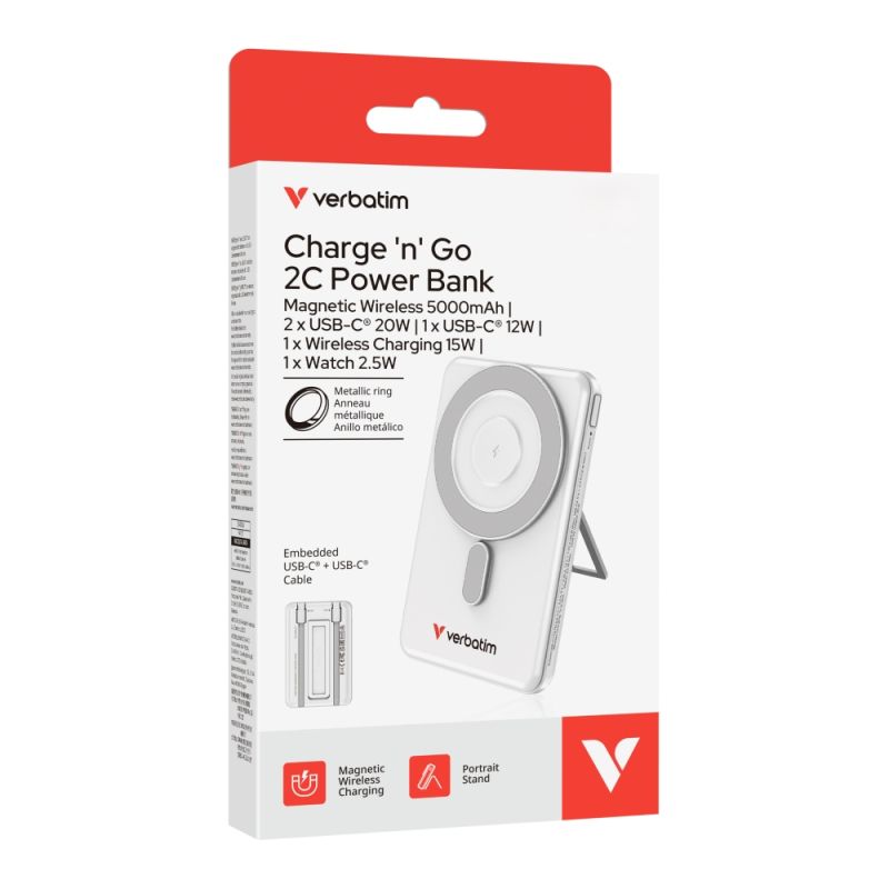 Външна батерия Verbatim Charge 'n' Go 2C Power Bank Magnetic Wireless 5000mAh with 2 USB-C Cables & Stand Silver