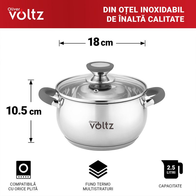 Тенджера Oliver Voltz OV51210N18, 18см, 2.5 л, Индукция, Силиконови дръжки, Инокс/сив
