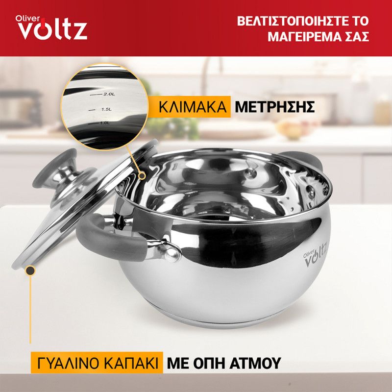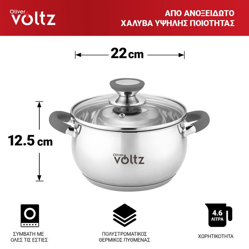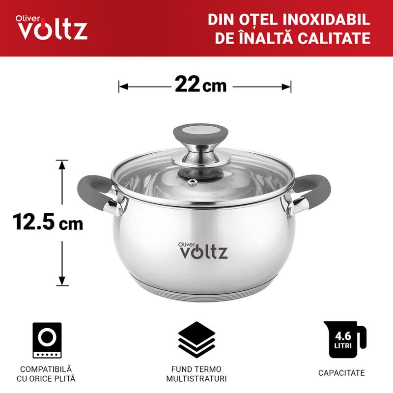 Тенджера Oliver Voltz OV51210N22, 22см, 4.6 л, Индукция, Силиконови дръжки, Инокс/сив