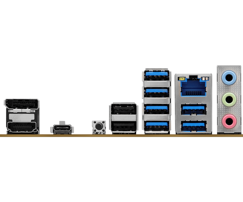 I/O:2 x Antenna Mounting Points;1 x HDMI Port;1 x DisplayPort 1.4;1 x USB 3.2 Gen2x2 Type-C Port (20 Gb/s);6 x USB 3.2 Gen1 Ports;2 x USB 2.0 Ports;1 x RJ-45 LAN Port;1 x BIOS Flashback Button;HD Audio Jacks: Line in / Front Speaker / Microphone
