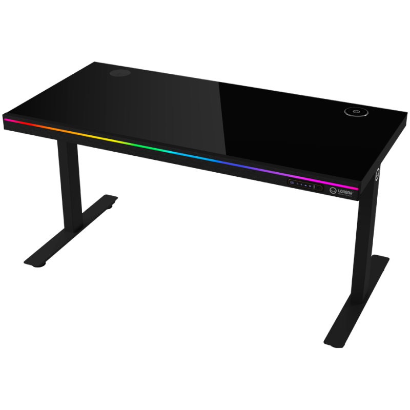 Геймърско бюро LORGAR LRG-DP80G, Dual-motor sit/stand adjustable-height gaming desk with wireless charger, RGB lighting, control panel, and USB ports, solid tempered glass tabletop, black.