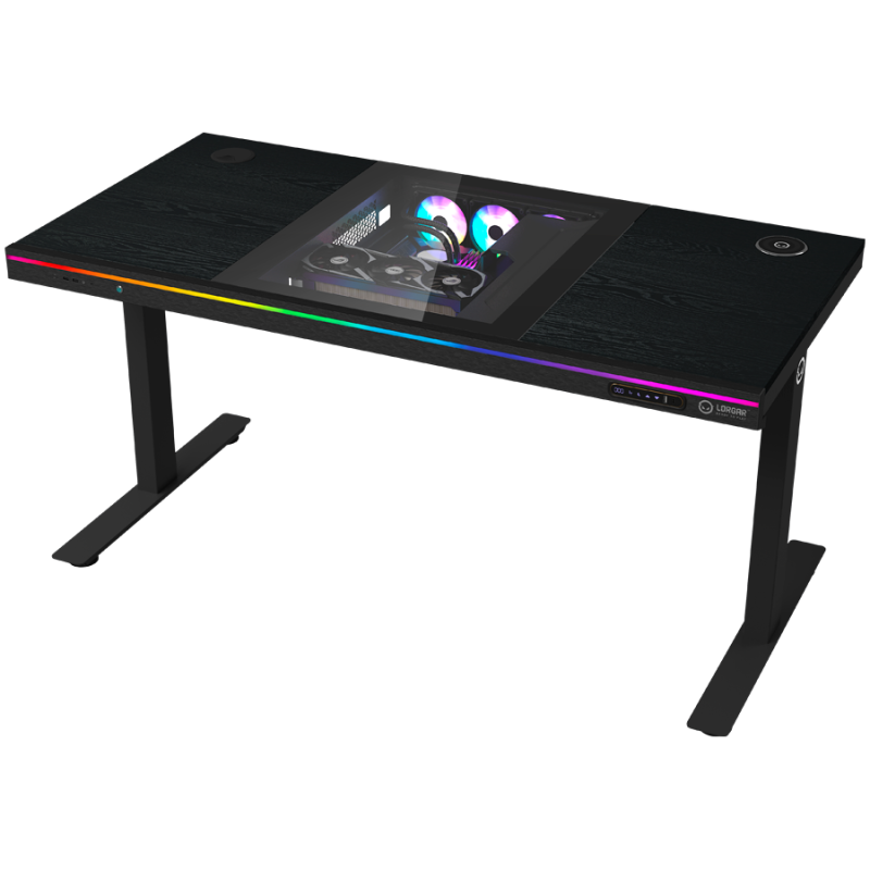Геймърско бюро LORGAR LRG-DE90W, Dual-motor sit/stand adjustable-height gaming desk with built-in PC case, wireless charger, RGB lighting, control panel, and USB ports, wooden tabletop, black.