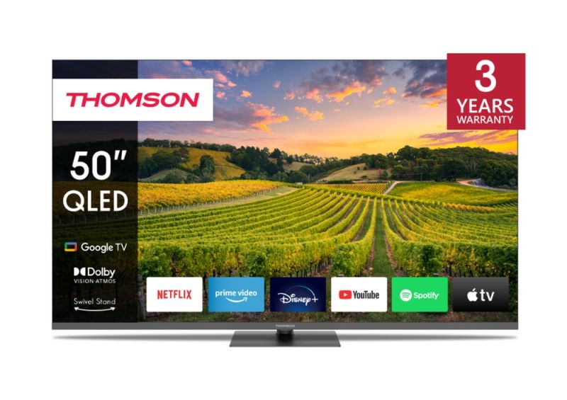 Телевизор Thomson 50" QLED Google TV; 3840 x 2160 (4K UHD), 4000:1, QLED, 60 Hz, DVB-T/T2/C/S/S2, HDR10, Wi-Fi, Bluetooth, LAN, HDMI 2 (2.0) + 2 (2.1), USB 2 (2.0) + 1 (3.0), Hotel mode, Central Swivel Stand, Dark gray